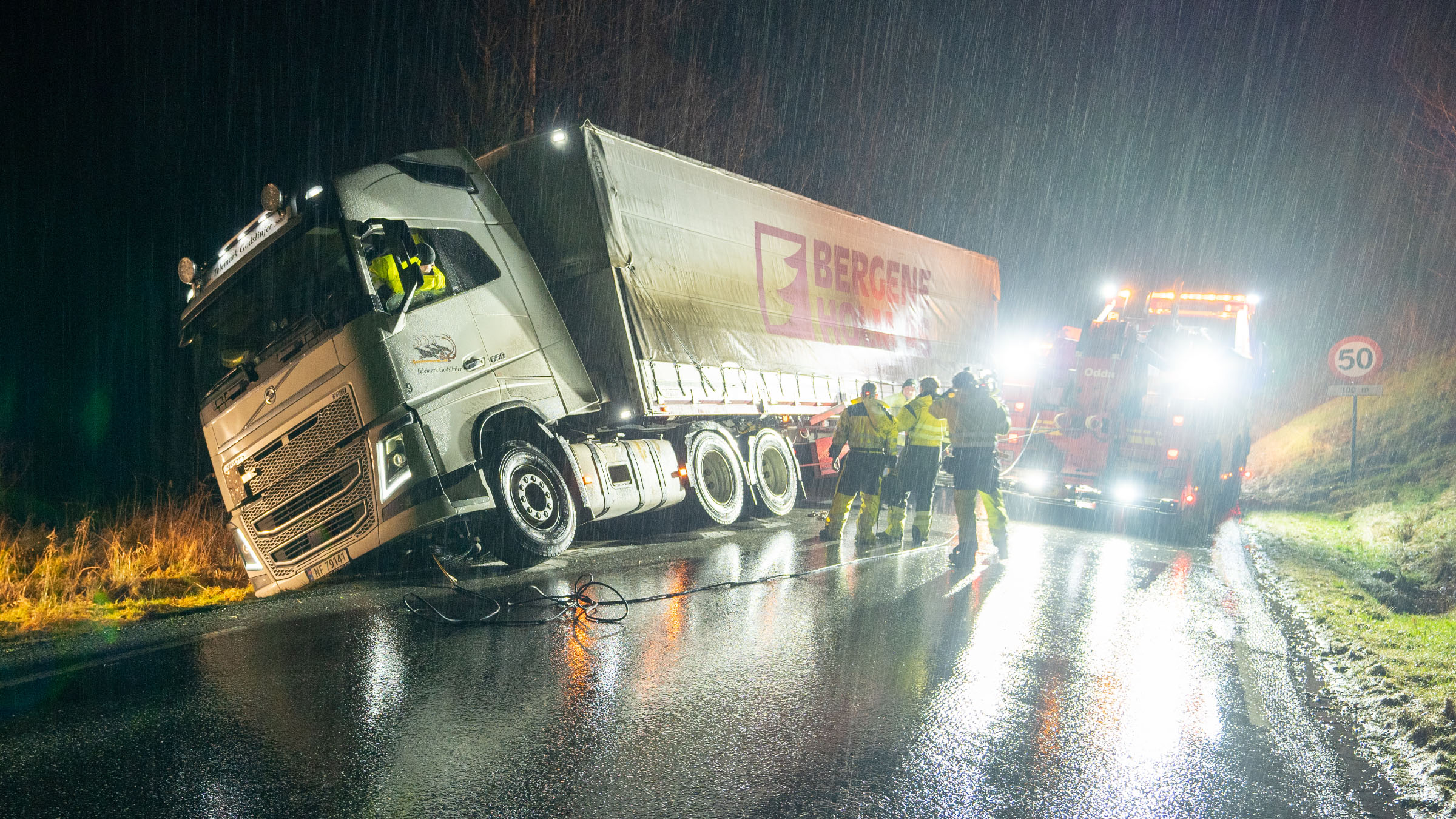 +Thord i Erlend zostają wezwani do ciężarówki, której kierowca nie dał sobie rady na śliskiej stromiźnie. Bjoern wykonuje zlecenie w tunelu.
