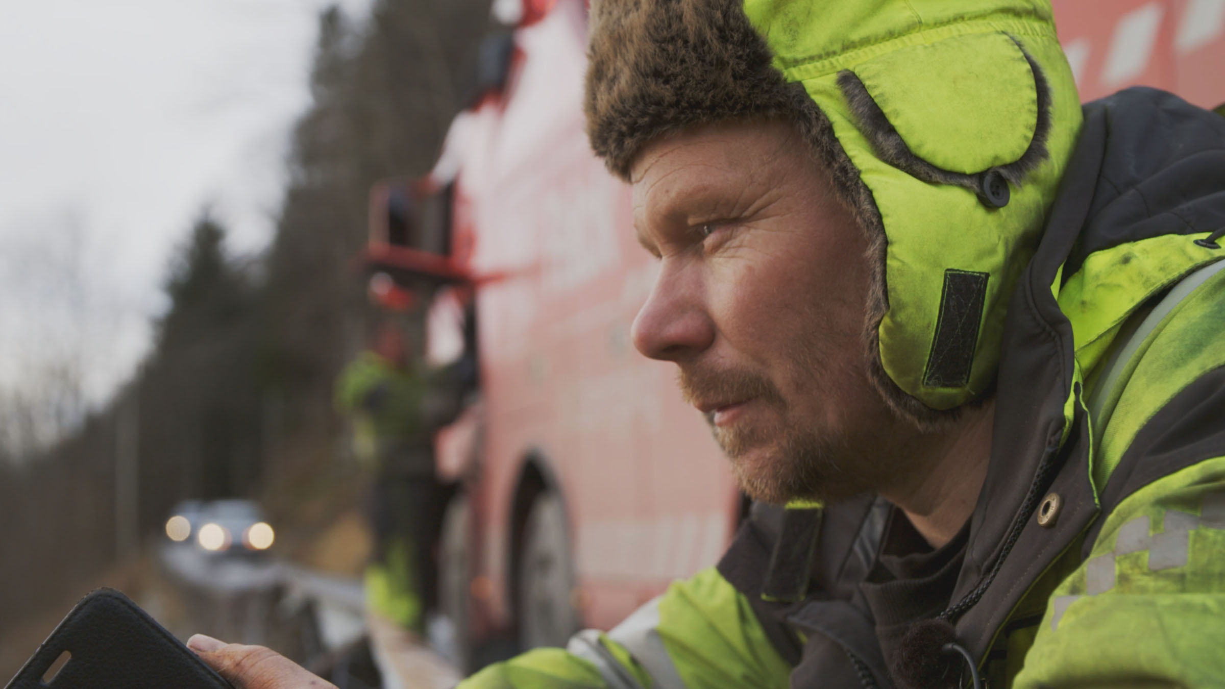 +Bjørn pracuje pod presją, by odblokować przejazd karetce. Thord pomaga kierowcy ciężarówki z ładunkiem, który musi dotrzeć do portu na czas.
