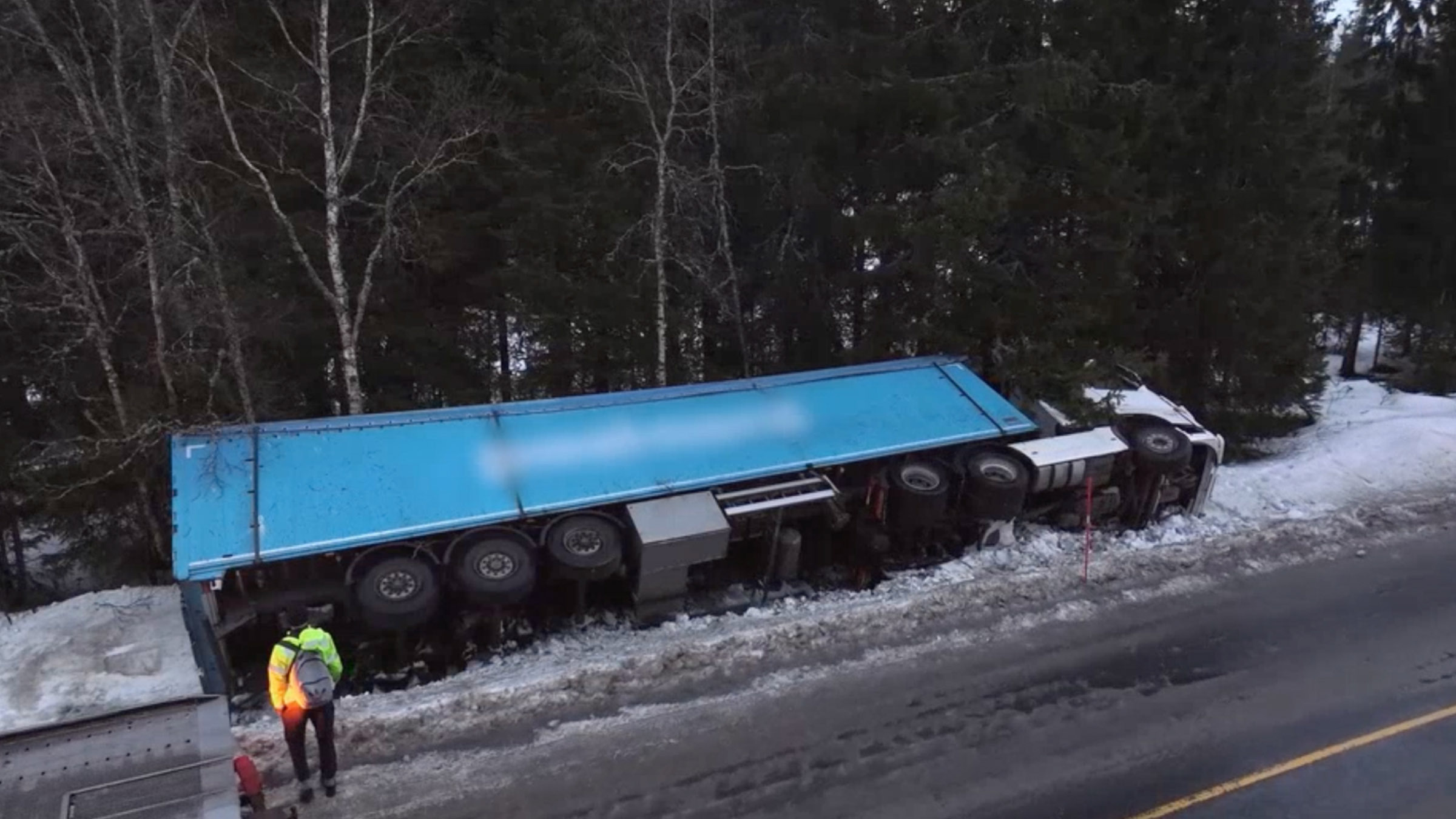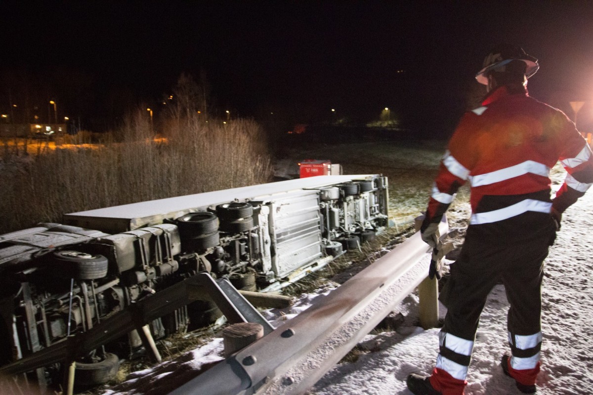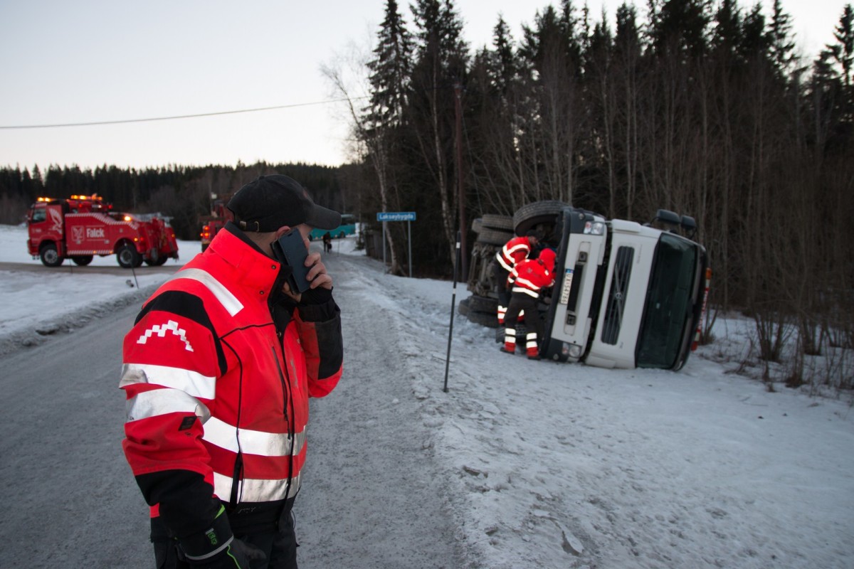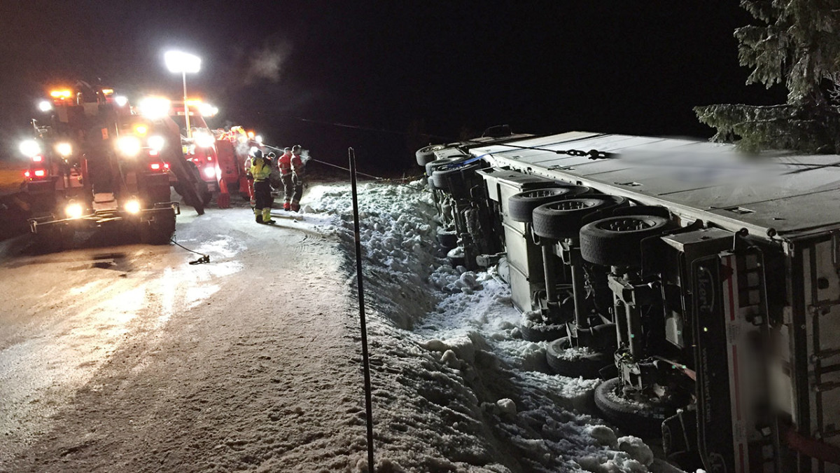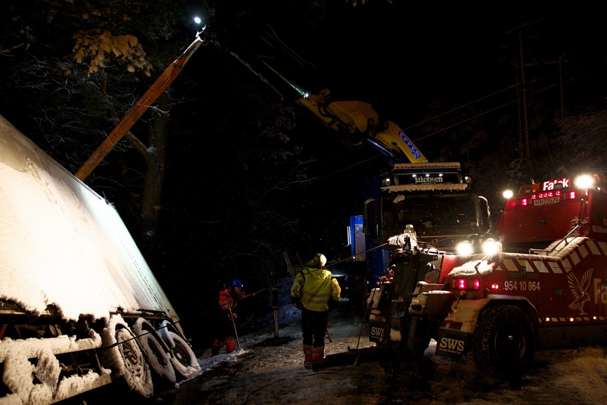 +Ogromna ciężarówka całkowicie zablokowała drogę. Kristoffer zajmuje się śmieciarką, która przewróciła się na śliskiej nawierzchni.