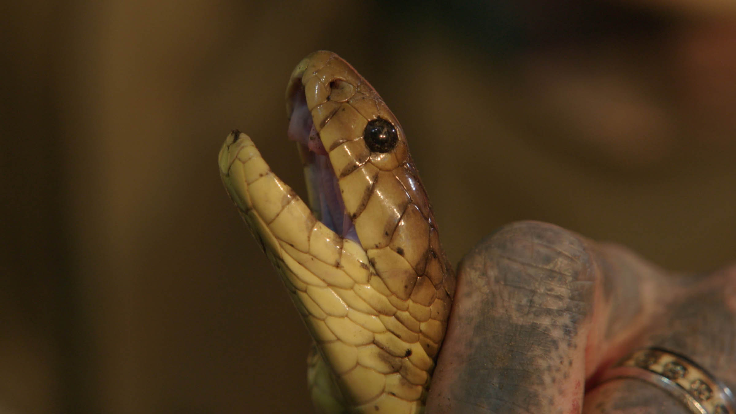 +Velika črna mamba se skrije pod kuhinjsko korito, Simon pa spleza na drevo, da bi ujel izjemno strupeno kačo vrste ahaetulla nasuta.