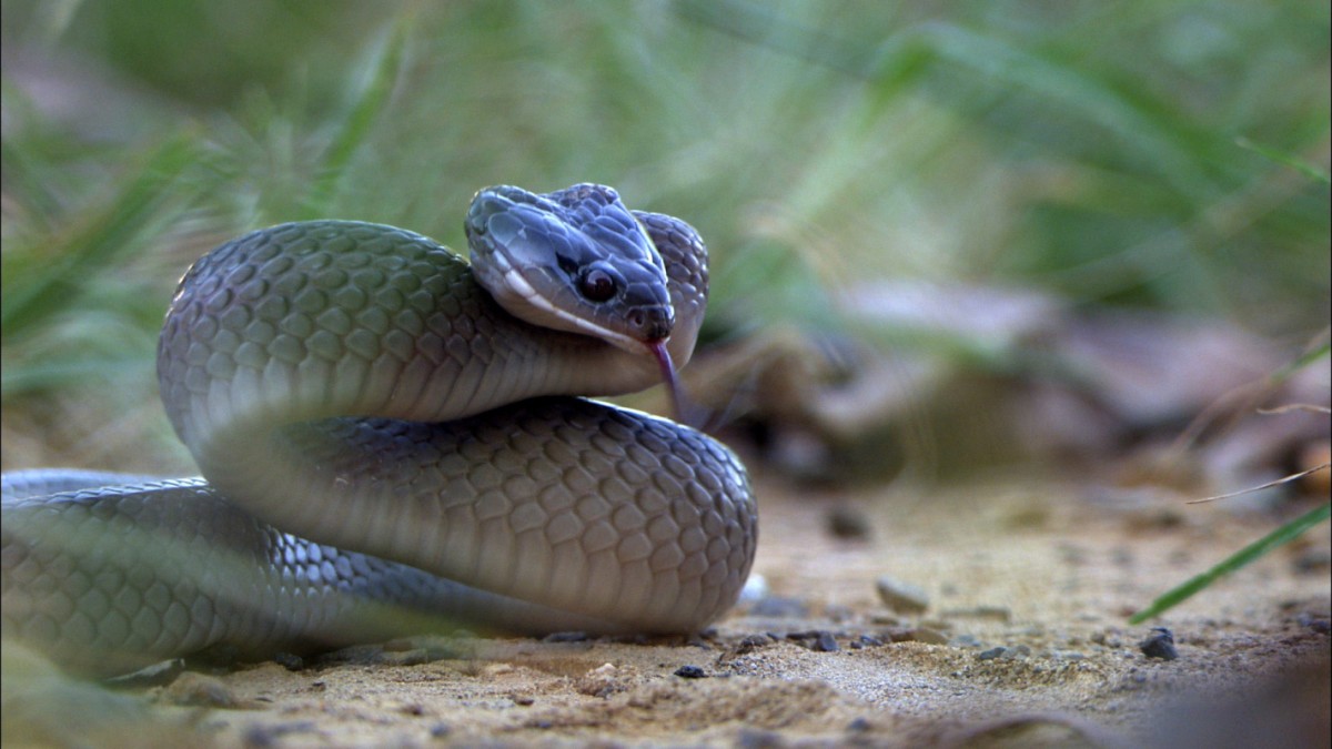 +Simon se sooči z več črnimi mambami in se za las izogne katastrofi, ko najde brejo kačo.
